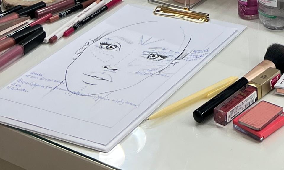 - Face Chart: Na koniec otrzymujesz ode mnie spersonalizowaną notatkę lub face chart (rysunek twarzy), na którym zaznaczamy, gdzie i co nakładałyśmy. Dzięki temu w domu bez problemu odtworzysz makijaż.